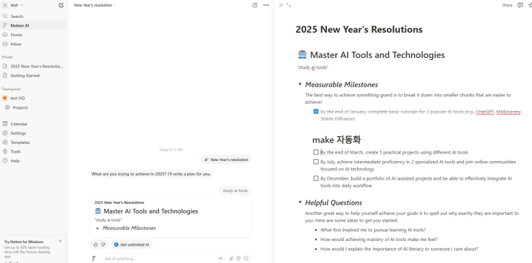 하지만 노션은 왼쪽상단의 진하게 체크된 AI 메뉴를 활용하면